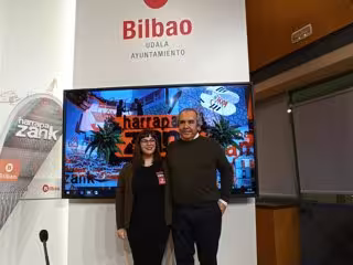 El concejal delegado del área de Euskera y Educación del Ayuntamiento de Bilbao, Koldo Narbaiza, acompañado por la representante de Euskaltzaleen Topagunea, Itxaso Paia, ha presentado esta nueva edición de 'Harrapazank'.