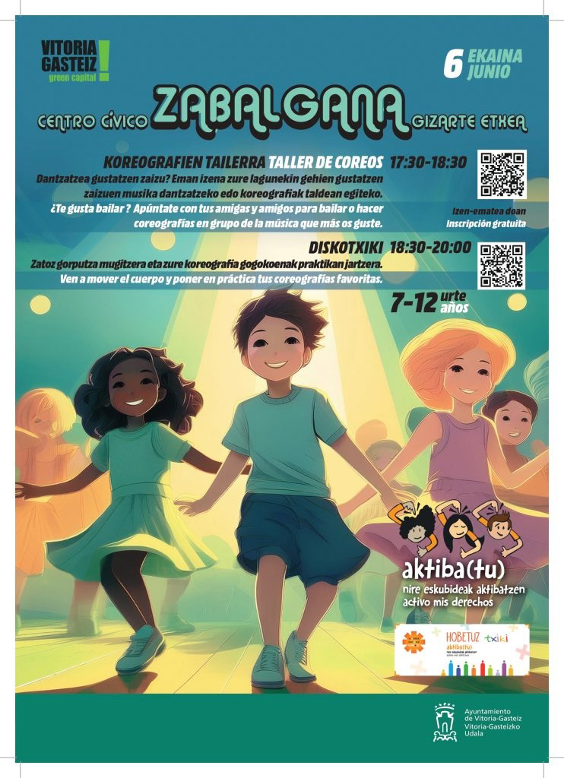 El centro cívico Salburua de Vitoria-Gasteiz acoge este viernes y el de Zabalgana el próximo 6 de junio sendos talleres infantiles para la creación de coreografías y una 'diskotxiki', dirigidas a niños y niñas de entre 7 y 12 años, como resultado de una iniciativa presentada a la sección infantil del programa de participación 'Vitoria-Gasteiz Hobetuz'.