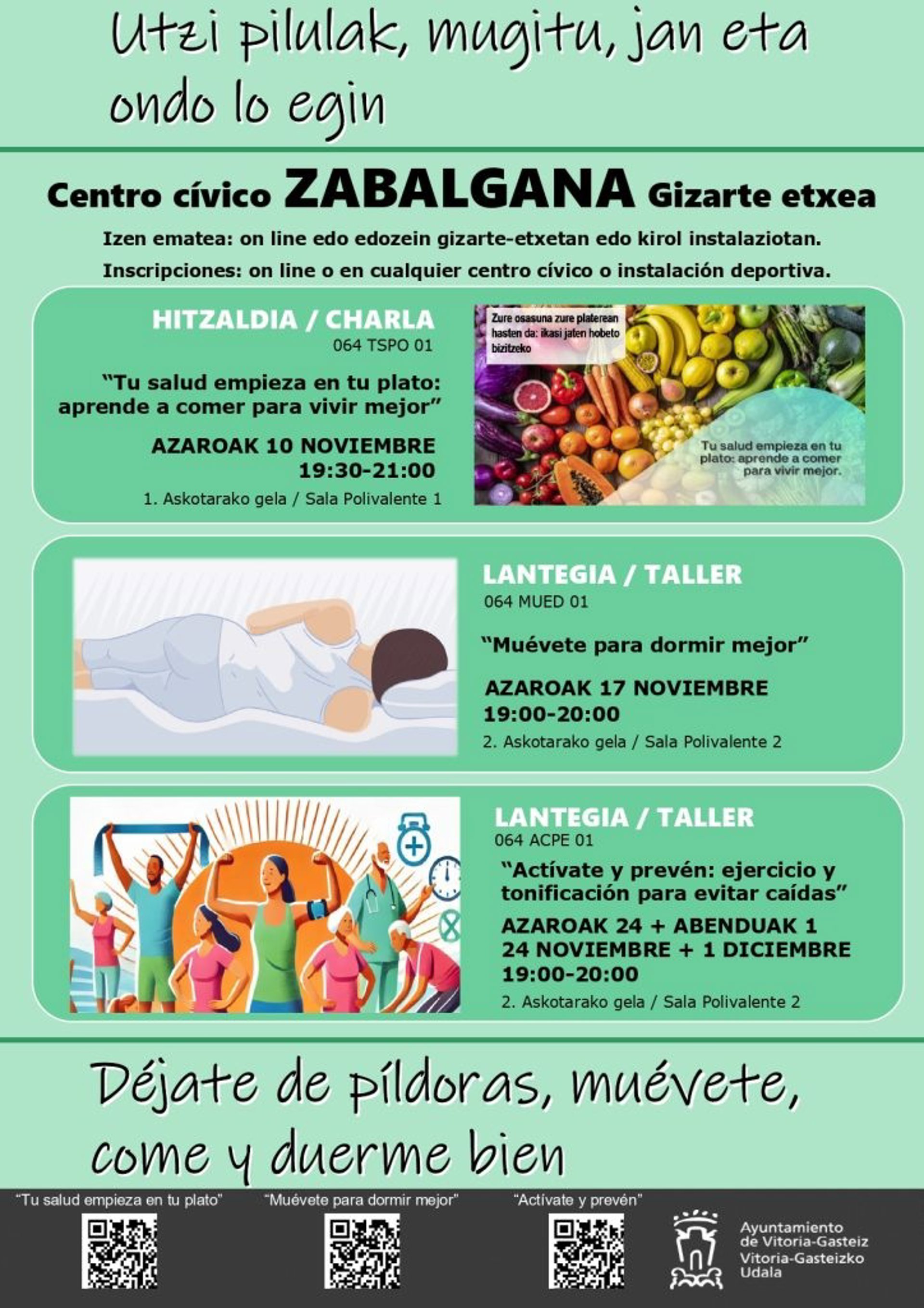 El programa 'Receta centro cívico' de Vitoria-Gasteiz retoma las actividades bajo el lema de 'Déjate de píldoras, muévete, come y duerme bien', para programar talleres y charlas centradas en la alimentación, el ejercicio como herramienta para dormir mejor y la prevención de caídas, durante los meses de octubre y noviembre en el barrio de Zabalgana.