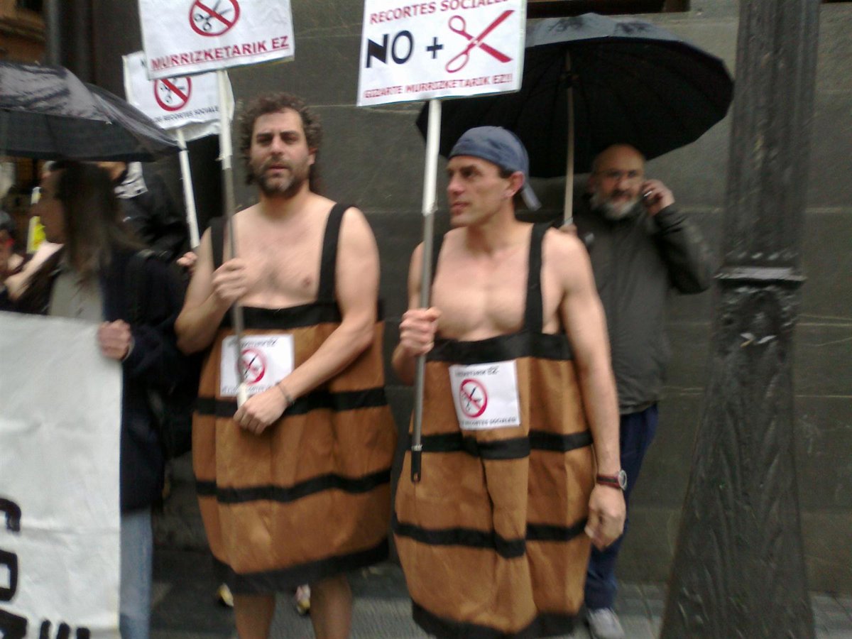Afectados por los "recortes" del Servicio Vasco de Empleo (Lanbide) han recorrido las calles de Bilbao cubiertos únicamente por un barril para protestar por "malas prácticas" del ente público, que "deja sin recursos y en la miseria a las familias afectadas por la actual crisis económica".