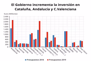 Cataluña ocupaba el segundo lugar en este ranking de inversiones autonómicas en el Presupuesto que preparó Rajoy y sigue siendo la segunda este año, porque la que mantiene el primer lugar es Andalucía, que de 1.477,75 millones en 2018 recibirá este año 2.132,77, el 17,5% del total y con un incremento de un año a otro del 44 por ciento.