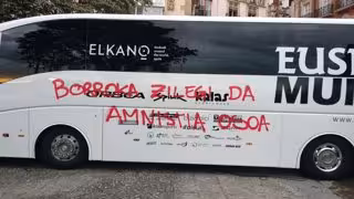 Se trata de vehículos de apoyo para la prueba y de los autobuses que trasladan a los ciclistas y, entre las pintadas, se podía leer "Borroka zilegi da. Aministia Osoa" (La lucha es legítima. Amnistía).