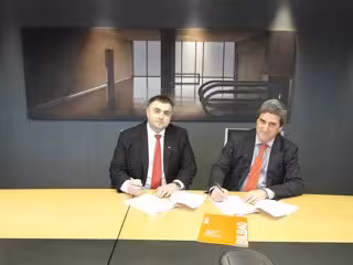 El director general de Bilbao Exhibition Centre (BEC), Xabier Basañez, y Marian Popescu, en representación del Ministerio de Turismo de Rumanía como cónsul general en Bilbao, han firmado este viernes un convenio de colaboración para la participación de Rumanía como 'país invitado' en Expovacaciones 2018.