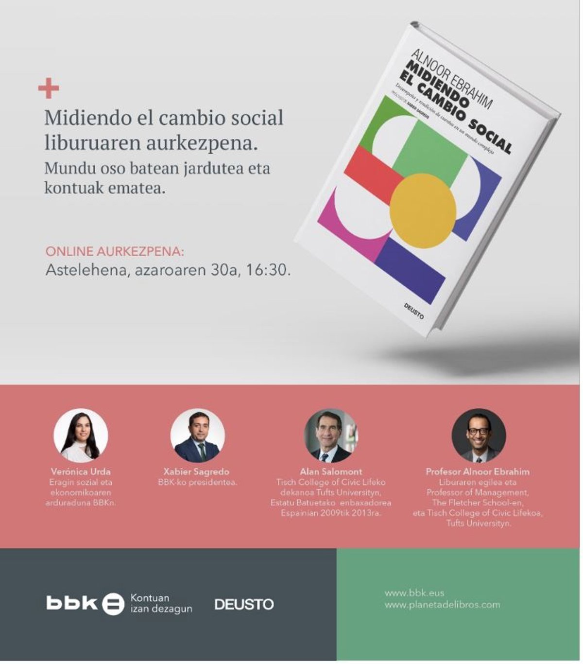 Junto a Xabier Sagredo, en la presentación online del libro han participado su autor, el profesor Alnoor Ebrahim, el decano del Tisch College of Civic Life en la Universidad de Tufts y embajador de Estados Unidos en España de 2009 a 2013, Alan Solomont, y la responsable de impacto social y económico en BBK, Verónica Urda.