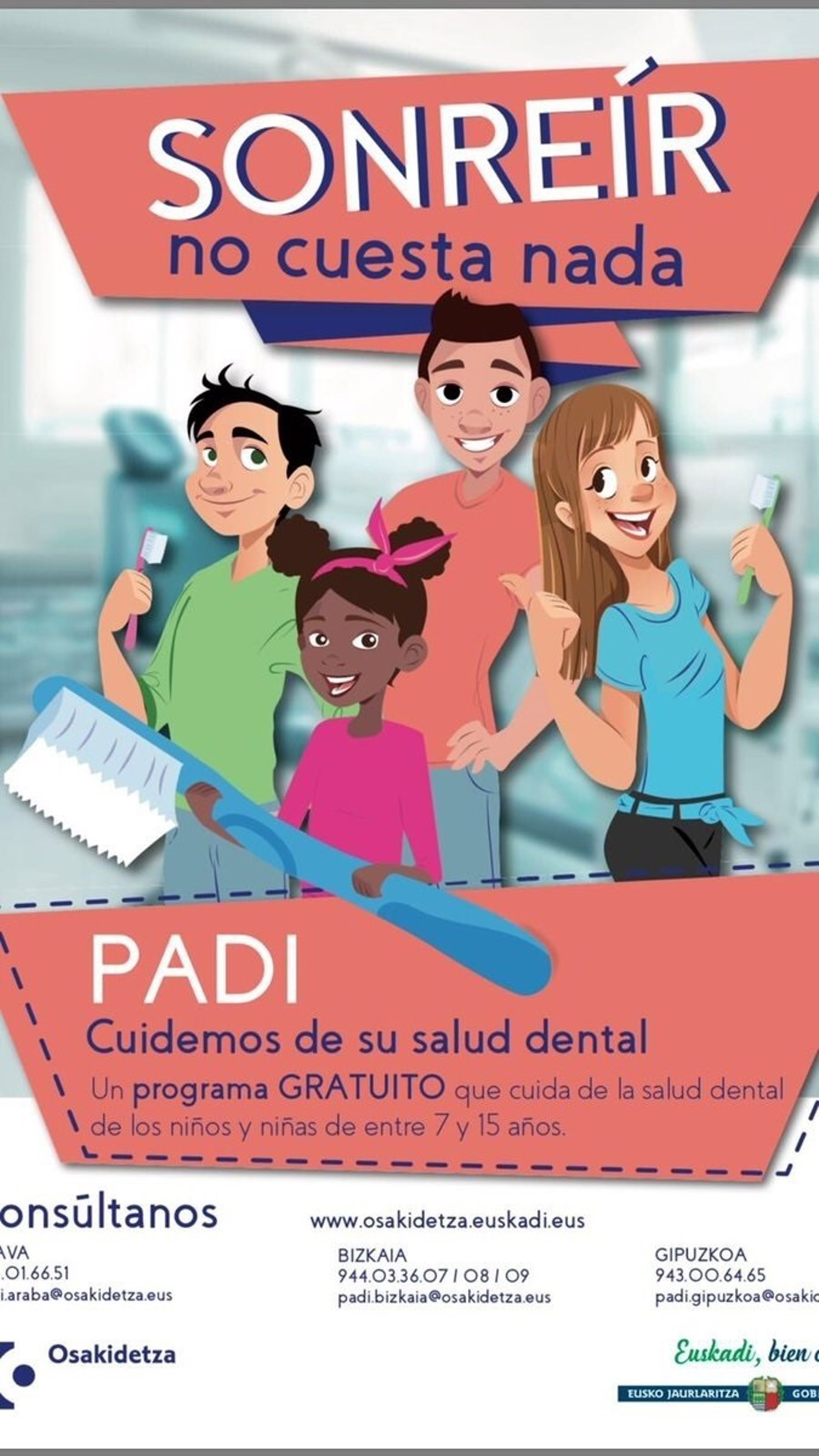 El Departamento de Salud y Osakidetza han puesto en marcha la campaña "Sonreír no cuesta nada" para aumentar el uso del Programa de Asistencia Dental Infantil (PADI) que, en la actualidad, tiene una tasa de cobertura del 66,38% pero el objetivo es que tenga una utilización anual del 75% en 2020 y que, para ese año, "el 80% de los niños de 12 años estén libres de caries".