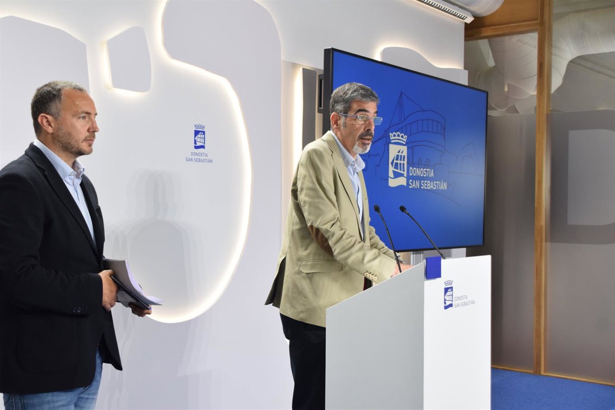 El alcalde de San Sebastián, Eneko Goia, junto al concejal de Gestión de personas, economía y presupuestos, Kerman Orbegozo, ha explicado en rueda de prensa que la modificación de las ordenanzas fiscales para 2025 "viene condicionada, por una parte, por el incremento de los costes que ha tenido el Ayuntamiento en la prestación de determinados servicios, y por otra, por la exigencia establecida por la Unión Europea relativa al el déficit cero en el servicio de recogida de residuos".