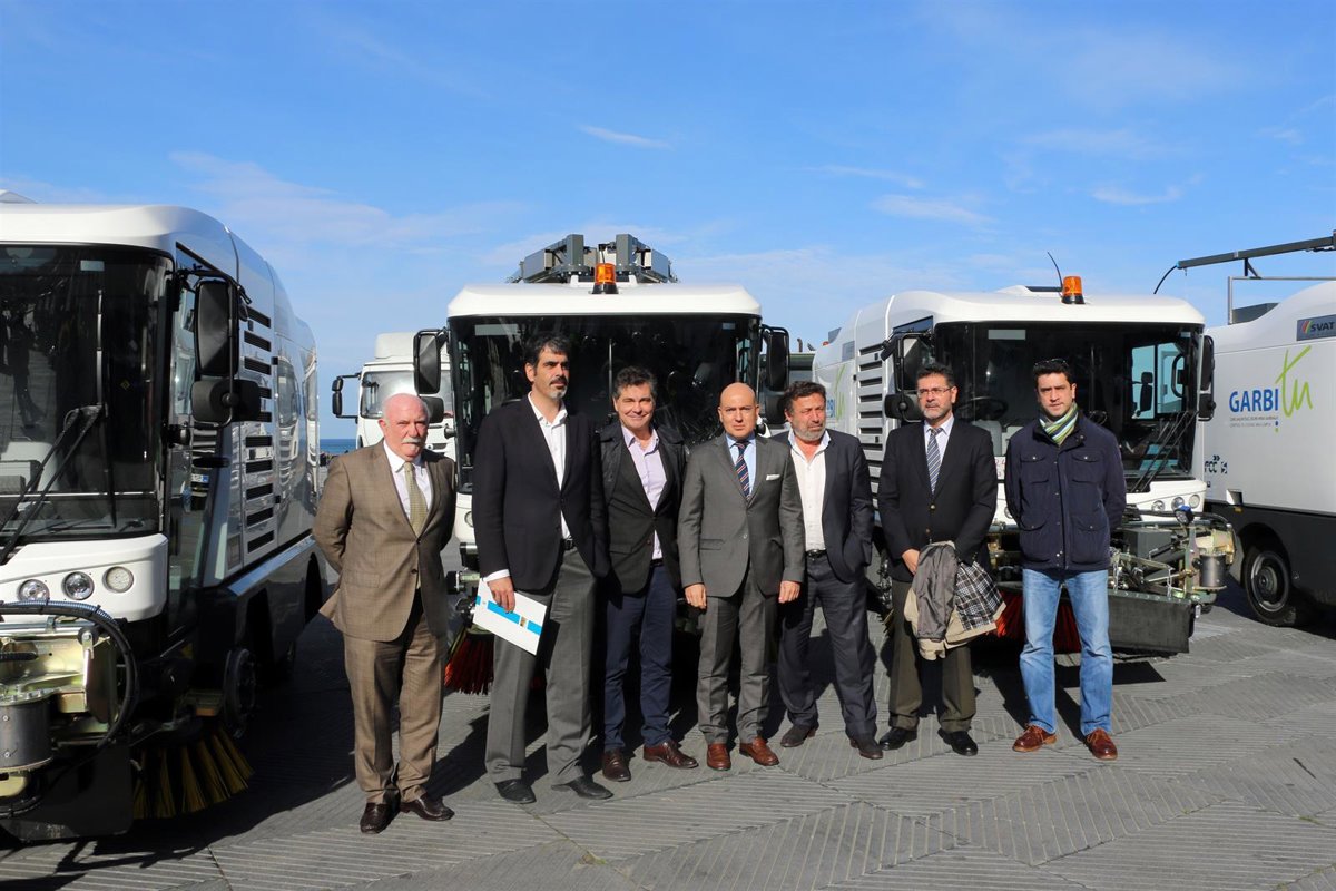El alcalde, Eneko Goia, el concejal de Espacios Públicos y Medio Ambiente, Alfonso Gurpegui, y representantes de las empresas encargadas del servicio de limpieza han presentado en el Kursaal las principales novedades derivadas del nuevo contrato, que estará en vigor los próximos años.