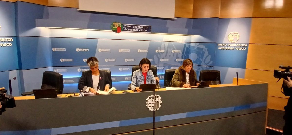 La consejera de Bienestar, Juventud y Reto Demográfico, Nerea Melgosa, junto a la directora de Apoyos para la Vida, Marian Olabarrieta, y la coordinadora de SATEVI, Oiane Zarate, han presentado este miércoles en Bilbao los datos de SATEVI, Servicio Telefónico de Atención a Víctimas de Violencia contra las Mujeres de Euskadi.