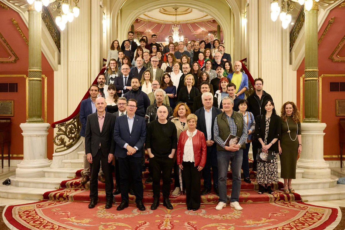 Presentación de temporada 2025-2026 de Teatro Arriaga, con Gonzalo Olabarria, Calixto Bieito e Itxiar Urtasun en el centro de primer plano. - TEATRO ARRIAGA
