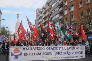 Trabajadores de Osakidetza se han manifestado este sábado en Bilbao bajo el lema 'Kalitatezko Osakidetza baten alde. Enplegua Sortu. No más robos (A favor de una Osakidetza de calidad. Creación de empleo. No más robos'), en el marco de las movilizaciones que están realizando de manera conjunta los sindicatos SATSE, ELA, LAB, SME-FFHH, CCOO, UGT y ESK.
