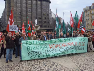 Una treintena de trabajadores se han concentrado este jueves en la plaza Moyua de Bilbao tras una pancarta en la que se podía leer, "Estaciones de Servicio de Bizkaia en favor del convenio. Repsol, Cepsa y Cebek, culpables".