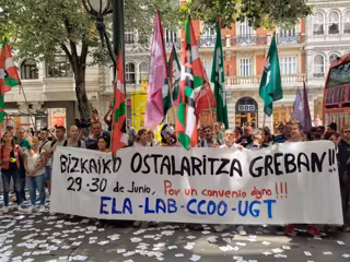 Los sindicatos ELA, LAB, CCOO y UGT han llamado a la huelga a alrededor de 20.000 trabajadores del sector de Hostelería de Bizkaia para este jueves y viernes, y se han concentrado ante la sede de la patronal en Bilbao, donde han advertido que "sin convenio, no hay Tour".