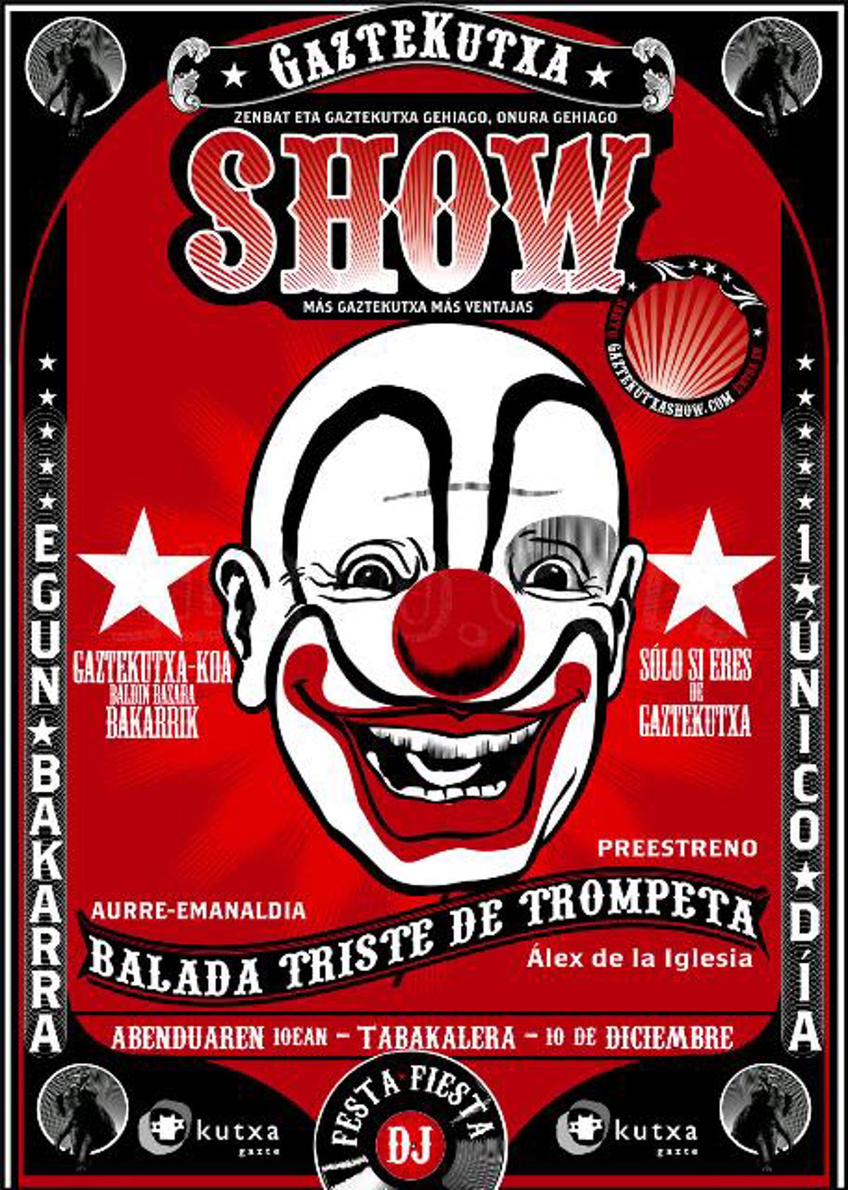 La Tabakalera de San Sebastián se convertirá este viernes en un viejo circo para acoger el preestreno de 'Balada triste de trompeta', la última película de Alex de la Iglesia, organizado por Gaztekutxa.