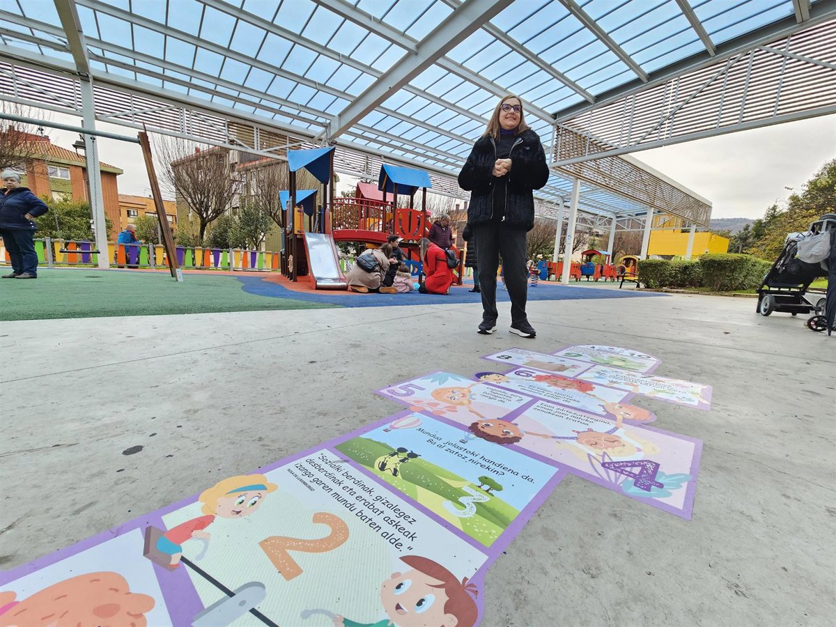 Iratxe Foces junto a la rayuela de la igualdad colocada en el parque de la Plaza de las Esculturas. - AYUNTAMIENTO DE BILBAO