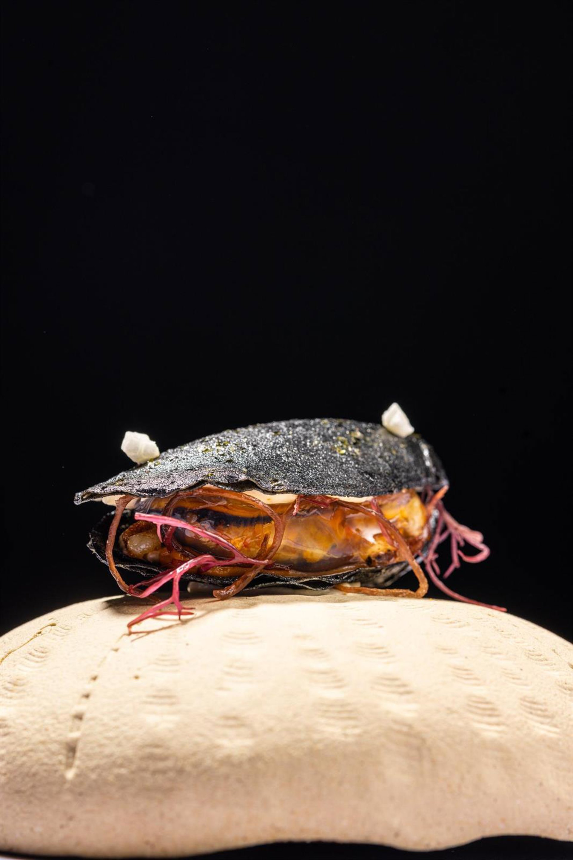 El pintxo 'Naiades', un trampantojo de mejillón de los chefs franceses Grégory Ménard y Lucile Voisin de Cambo les Bains ha ganado el XVIII Campeonato de pintxos 18/70 de Euskal Herria.