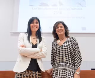Nekane Balluerka y Beatriz Artolazabal durante presentación encuesta inserción laboral alumnado de UPV - UPV/EHU