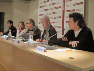 Txema Urkijo (Dirección Víctimas Terrorismo Vasco), Maixabel Lasa (víctima ETA), Rafael Grasa (ICIP), Esther Pascual (coordinadora Los ojos del otro) y mediador Eduardo Santos, en una comparecencia pública en 2014 - EUROPA PRESS - Archivo
