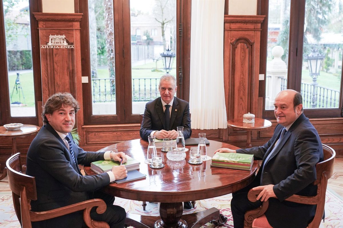 (I-D) El secretario general del PSE-EE, Eneko Andueza; el lehendakari, Iñigo Urkullu y el presidente del PNV, Andoni Ortuzar, durante una reunión, en el Palacio de Ajuria Enea, a 19 de febrero de 2024, en Vitoria-Gasteiz, Álava, País Vasco (España). - Iñaki Berasaluce - Europa Press