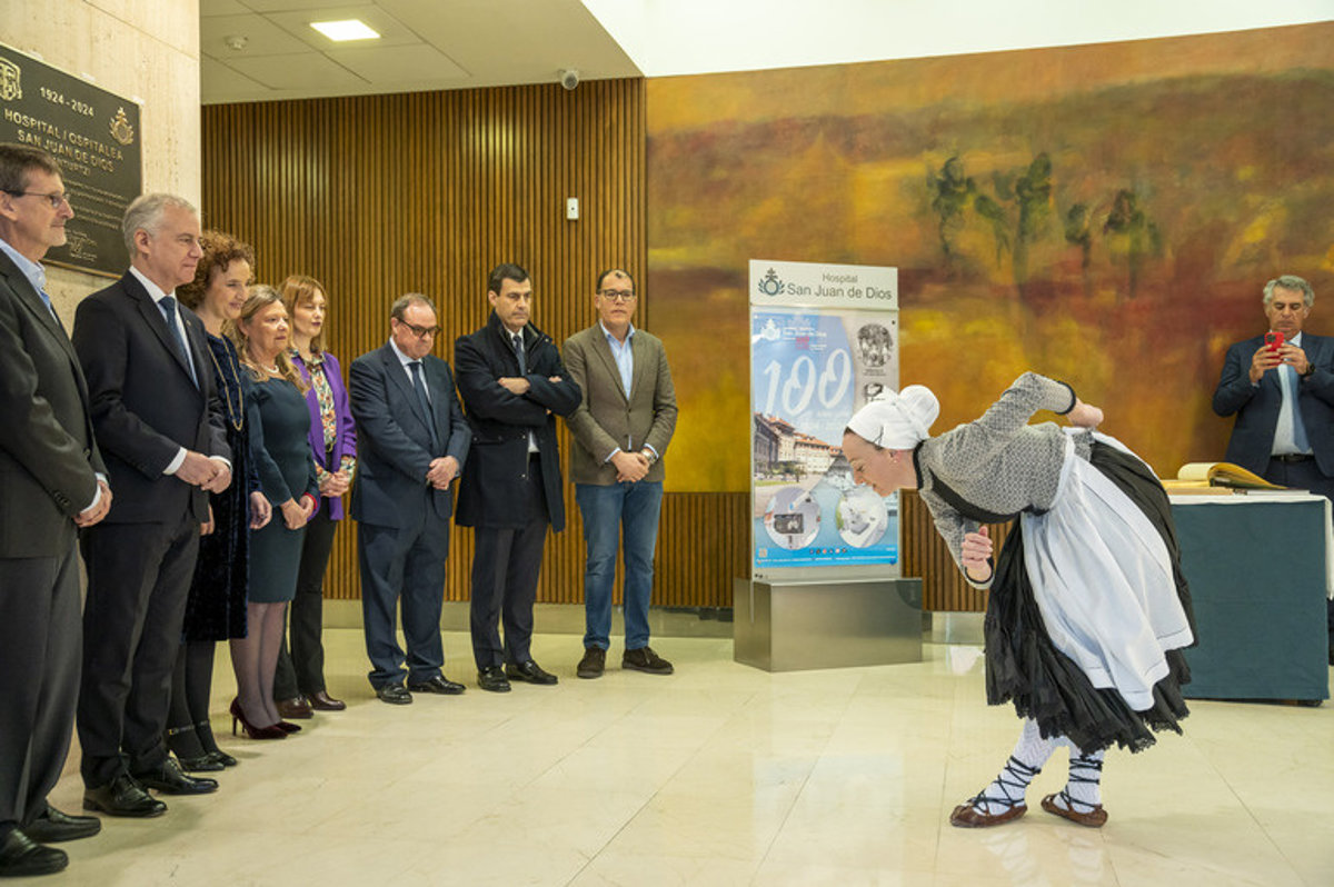 Tras un aurresku de honor, se ha realizado una foto de familia y se ha descubierto una placa conmemorativa de la efeméride en el vestíbulo de entrada al centro sanitario. En ese momento, el Lehendakari ha firmado en el libro de honor del Hospital San Juan de Dios.