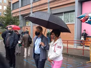 A las nueve y media de la mañana, Urkullu se ha acercado al colegio público Zabalarra de la localidad vizcaína de Durango, junto a su mujer, Lucía Arieta-Araunabeña, para ejercer su derecho a voto. Bajo un paraguas y con mascarilla --el Lehendakari llevaba una con una ikurriña a un lado--, ambos han accedido al centro de votación.