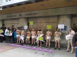 Varias personas pertenecientes a colectivos antimilitaristas y activistas contra el TAV y por los derechos sociales se han concentrado "en pañales" a las puertas de la Delegación del Gobierno vasco, en Bilbao, para denunciar el "despilfarro de recursos económicos que supone el gasto militar y las obras de construcción del TAV, y más en una época de crisis económica y de recortes sociales como la actual".