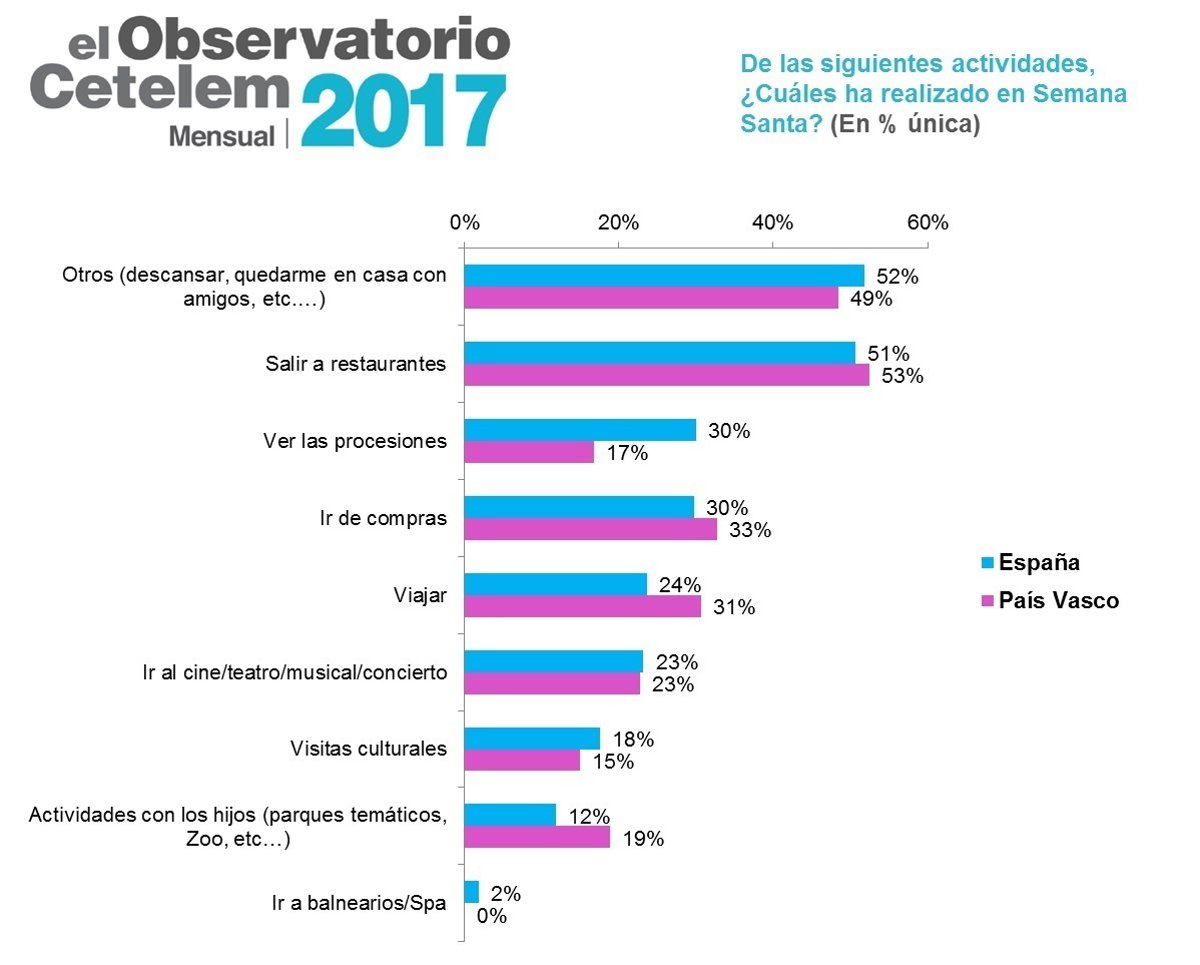 En cuanto a las actividades preferidas durante estos días, salir a restaurantes, descansar y quedar con amigos e ir de compras, fueron las actividades más realizadas por los vascos en Semana Santa.
