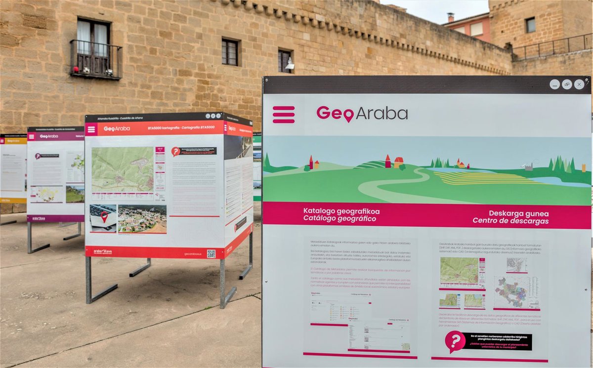 La muestra itinerante Geoaraba recalará en la Plaza de la Provincia de Vitoria-Gasteiz del 22 de marzo hasta el 2 de abril para dar a conocer el portal geográfico de la Diputación Foral y presentar el contenido de toda la información sectorial que se puede consultar de diferentes temáticas.