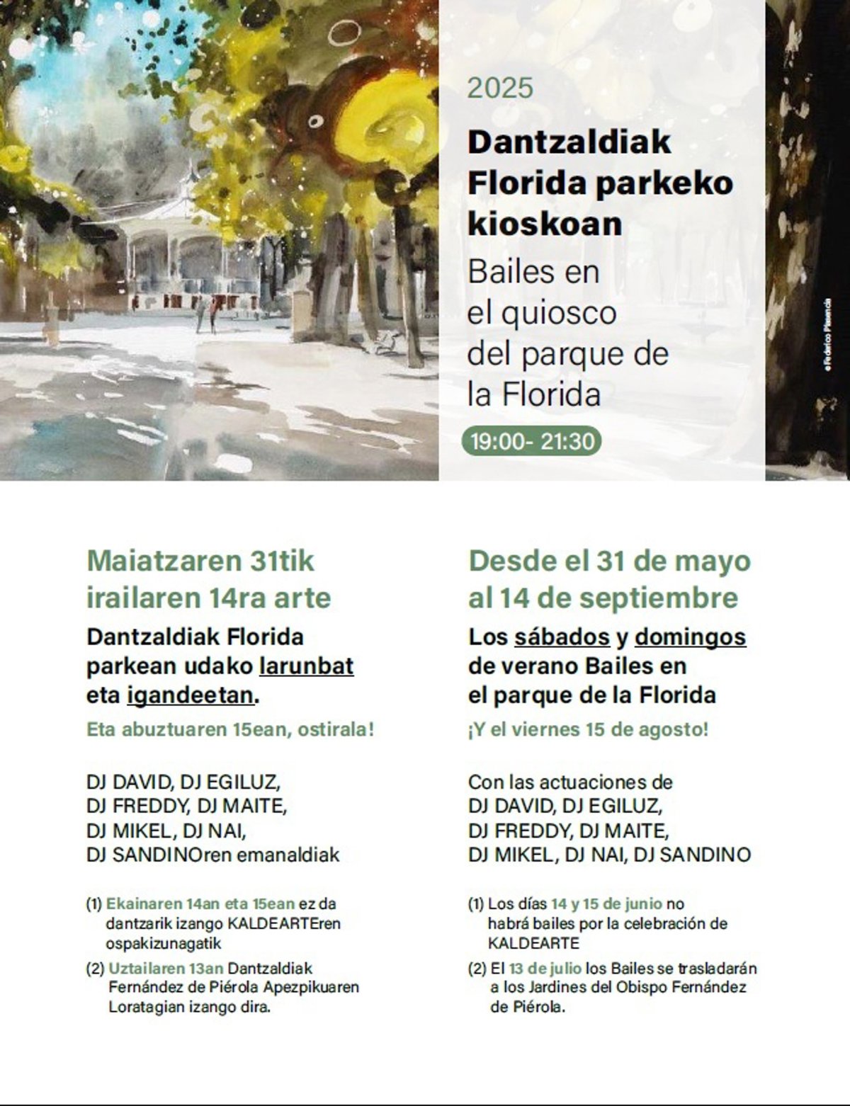 La temporada de verano de los habituales bailables en el quiosco del parque de La Florida de Vitoria-Gasteiz se adelantan al próximo fin de semana del 31 de mayo para celebrarse durante todos los sábados y domingos hasta el 14 de septiembre, de 19.00 a 21.30 horas.