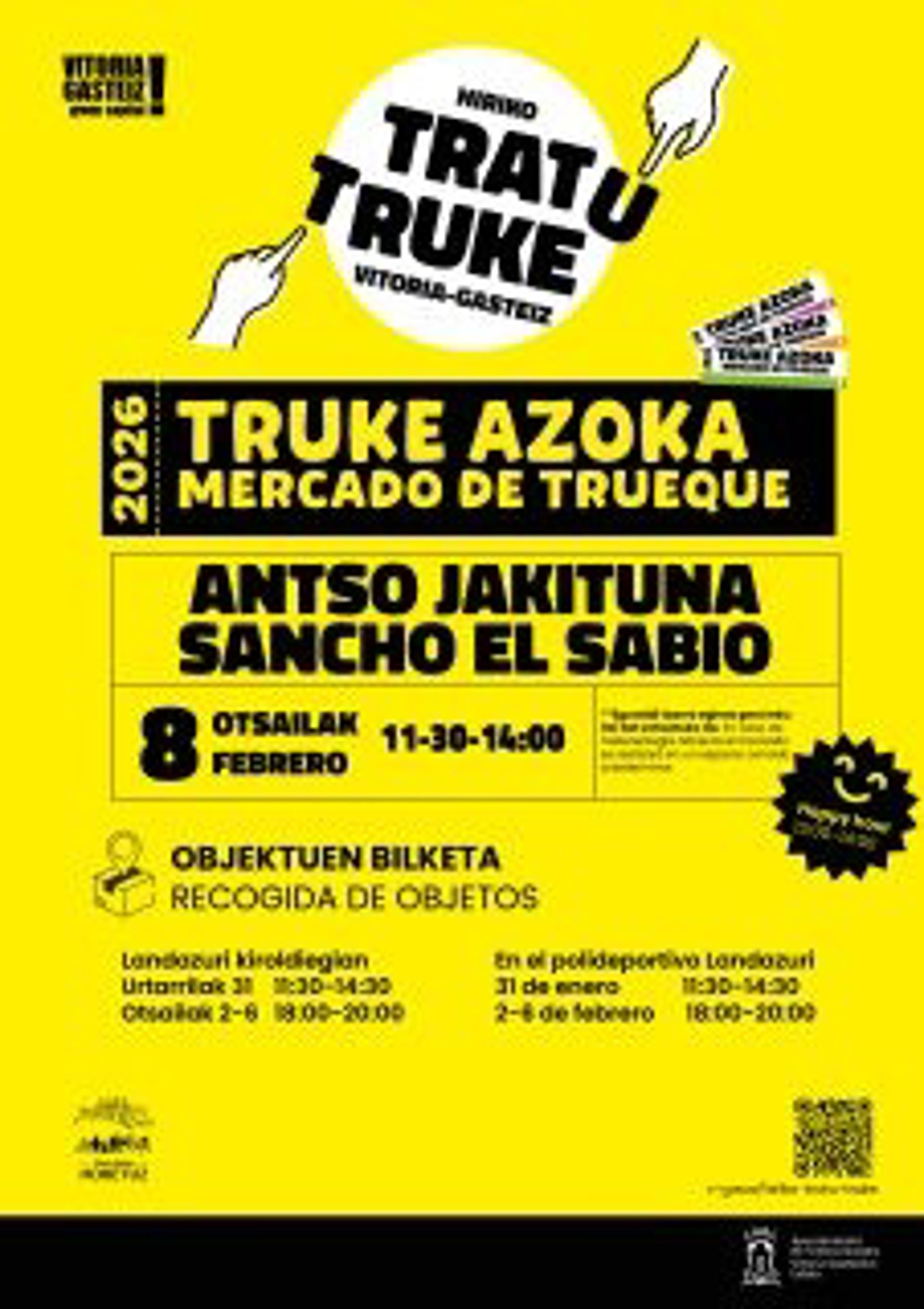 El programa de participación ciudadana del Ayuntamiento 'Vitoria-Gasteiz Hobetuz' ha organizado un mercado de trueque el próximo domingo 8 de febrero, de 11.30 a 14.00 horas, en la zona de la pérgola de la calle Sancho El Sabio, con el objetivo de dar una segunda vida a objetos que no se utilizan.