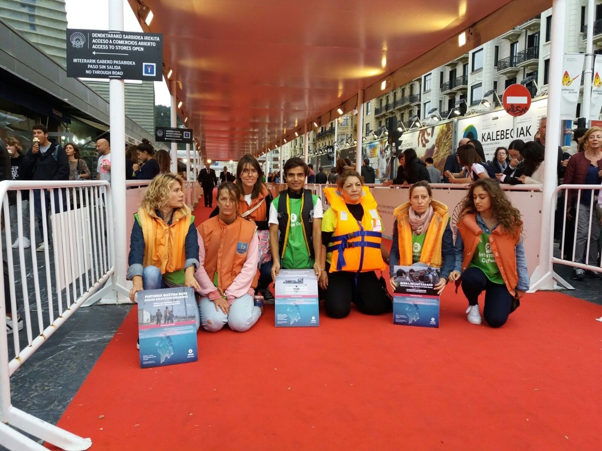 Voluntarios de Oxfam Intermón de San Sebastián han aprovechado la celebración en la ciudad del 64 Festival Internacional de Cine donostiarra para reclamar "el derecho a refugio" con motivo de la celebración este lunes en Nueva York de la Cumbre de la ONU sobre personas migrantes y refugiadas.