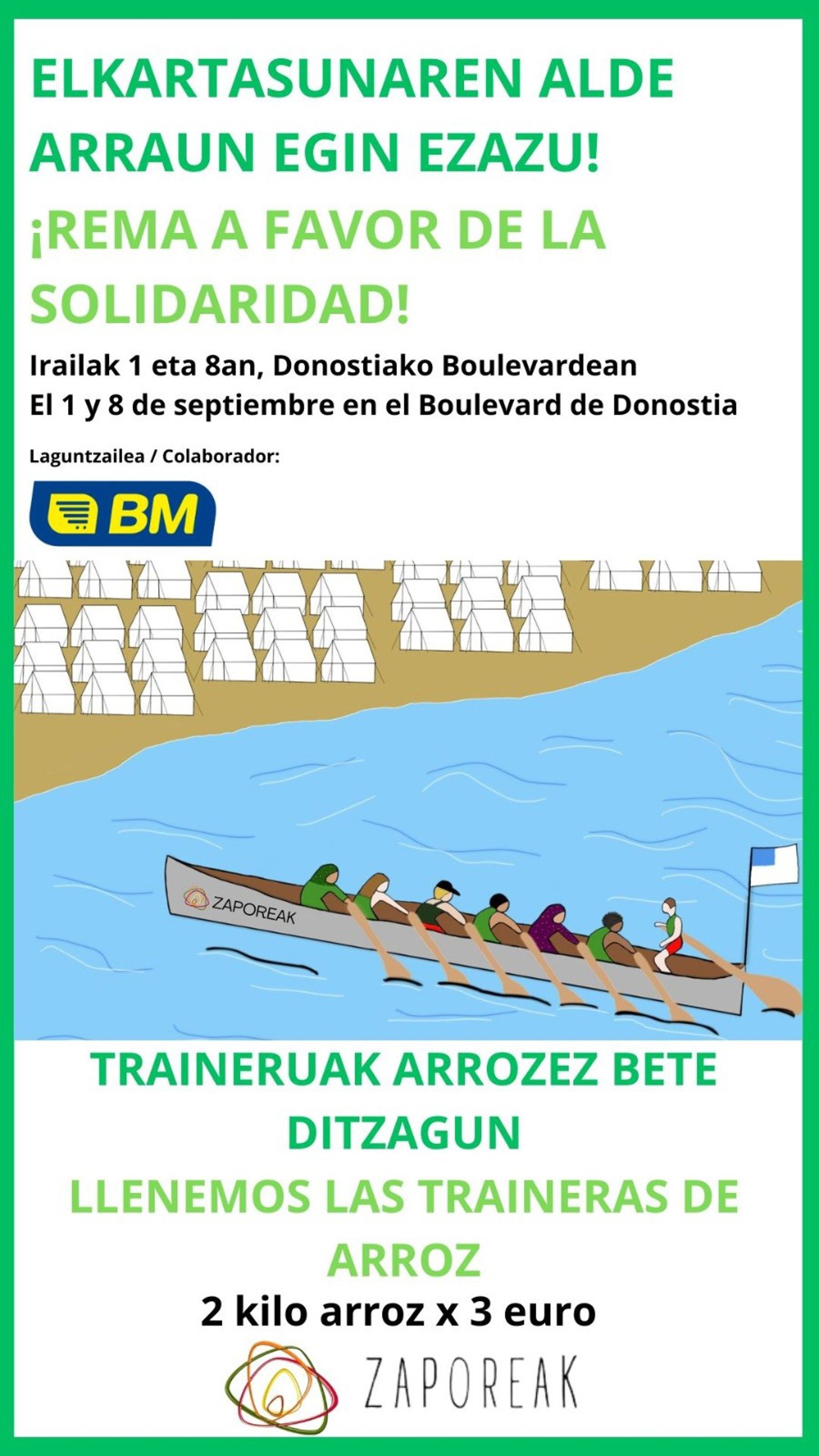 En un comunicado, Zaporeak ha señalado que montará un puesto de recogida de arroz durante las regatas en el Boulevar donostiarra "para llenar metafóricamente esas traineras, tan parecidas a las pateras en las que llegan las personas solicitantes de asilo a Lesbos y darle la vuelta".