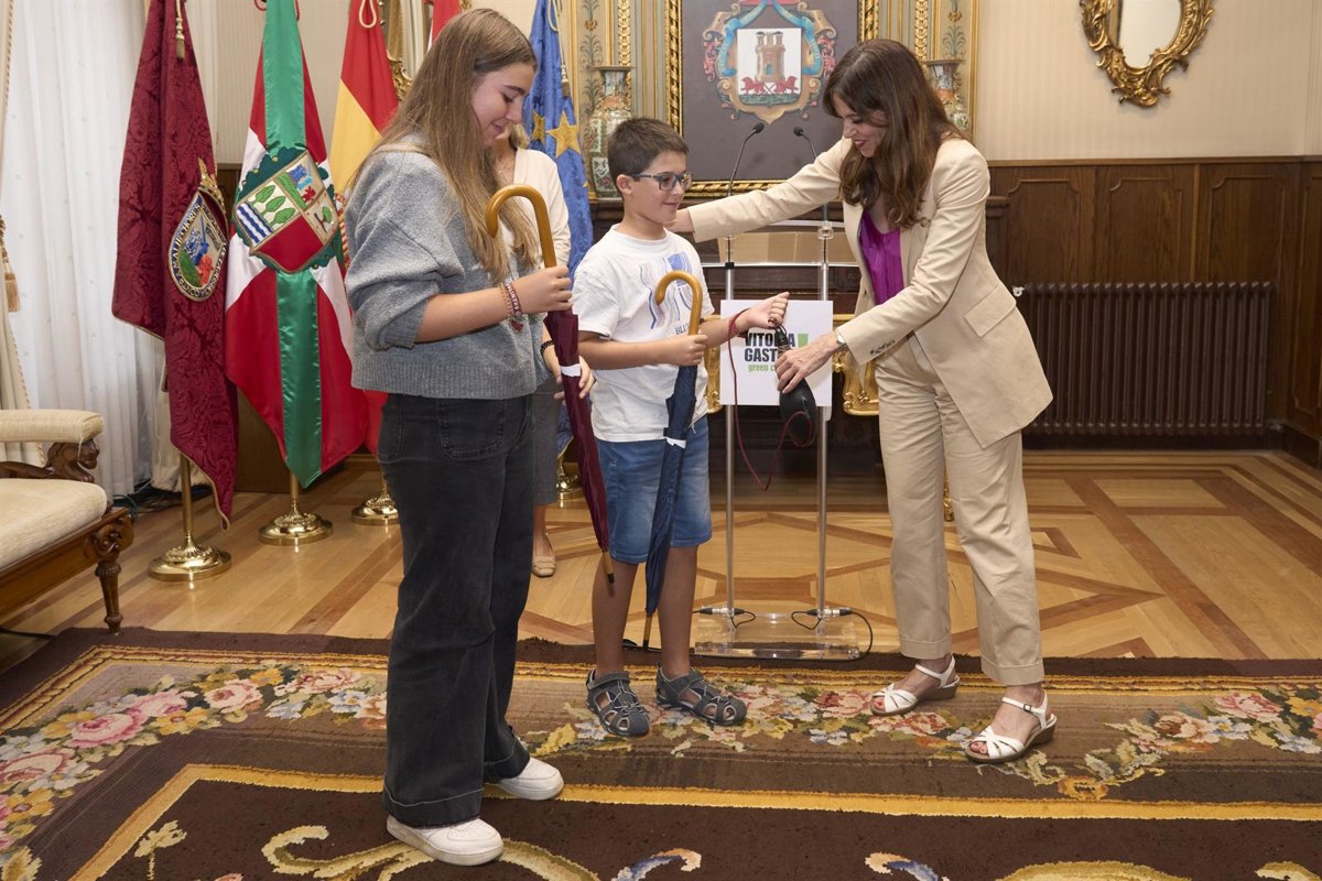 Maider Etxebarria alkateak harrera egin die asteazken honetan udaletxean, eta, Sonia Diaz de Corcuera Kultura zinegotziarekin batera, abuztuaren 7an txikienei eskainitako egunean eskuetan izango dituzten aterkiak eta ardo zahatoa eman dizkie.