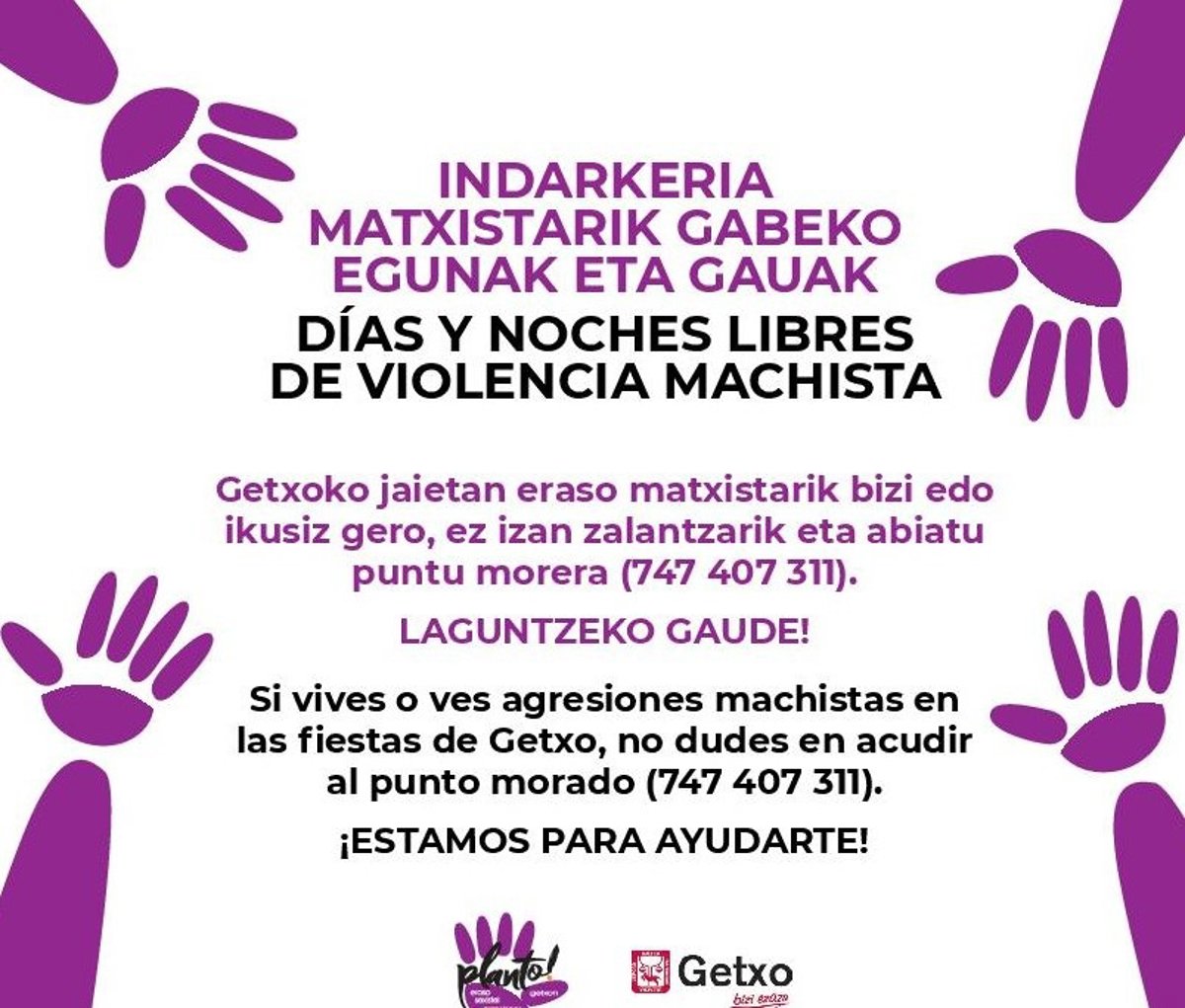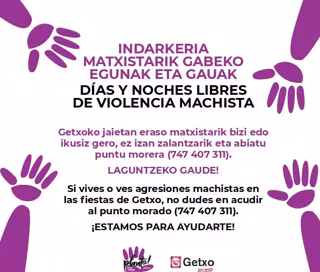 Getxoko Udalak (Bizkaia) gune morea jarriko du aurten ere udalerriko jaietan, erasoen biktimei zaintza eta laguntza zuzena eta berehalakoa emateko eta indarkeria matxistari buruz sentsibilizatzeko gune seguru batean.