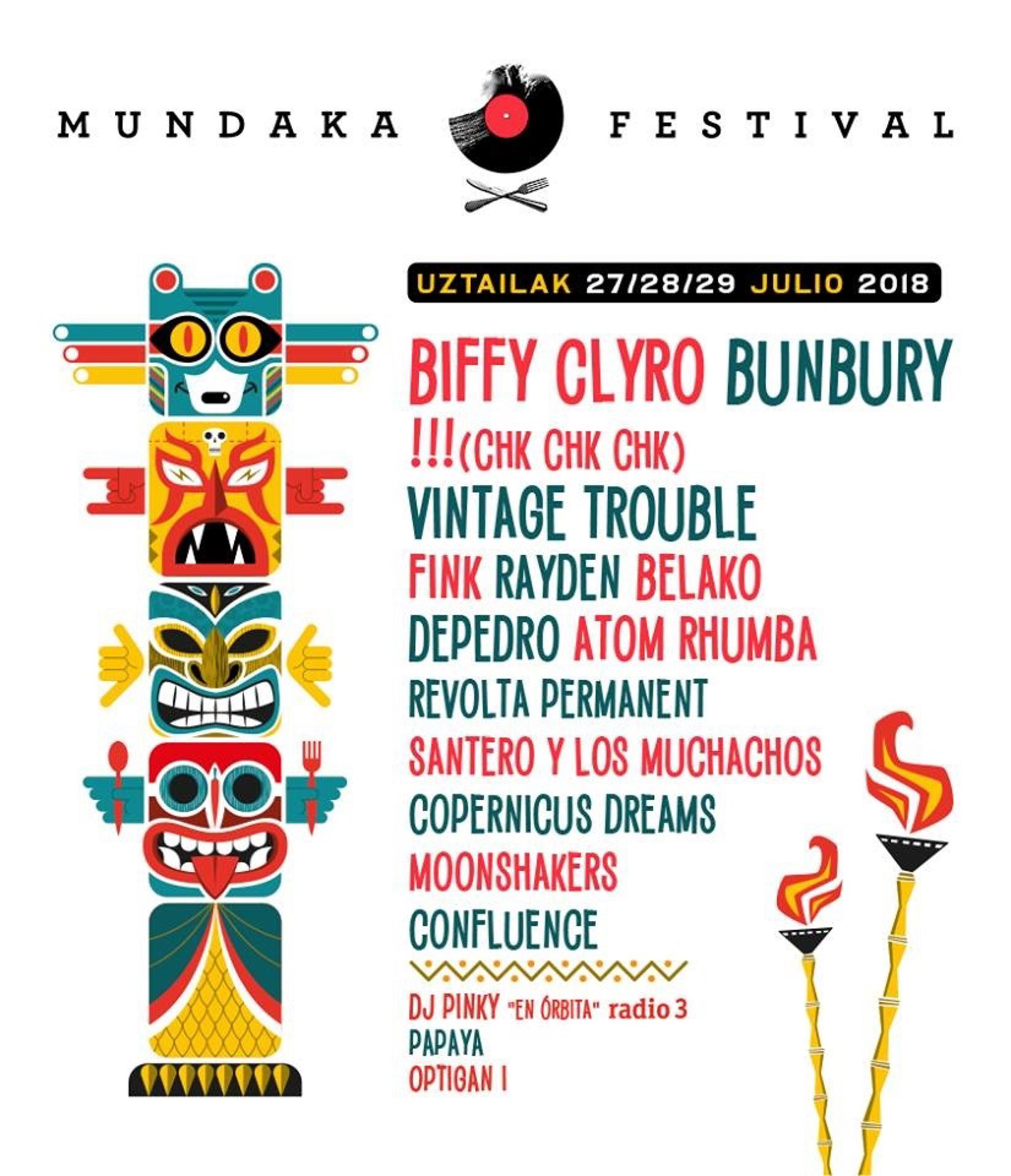 Biffy Clyro, Atom Rhumba, Santero y Los Muchachos, Copernicus Dreams, Moonshakers eta Confluence taldeak Mundaka Festival jaialdian izango dira, dagoeneko iragarrita zeuden Bunbury, !!! (Chk, Chk, Chk), Vintage Trouble, Fink, Rayden, Belako, Depedro eta Revolta Permanent taldeekin batera, antolakuntzak iragarri duenez.