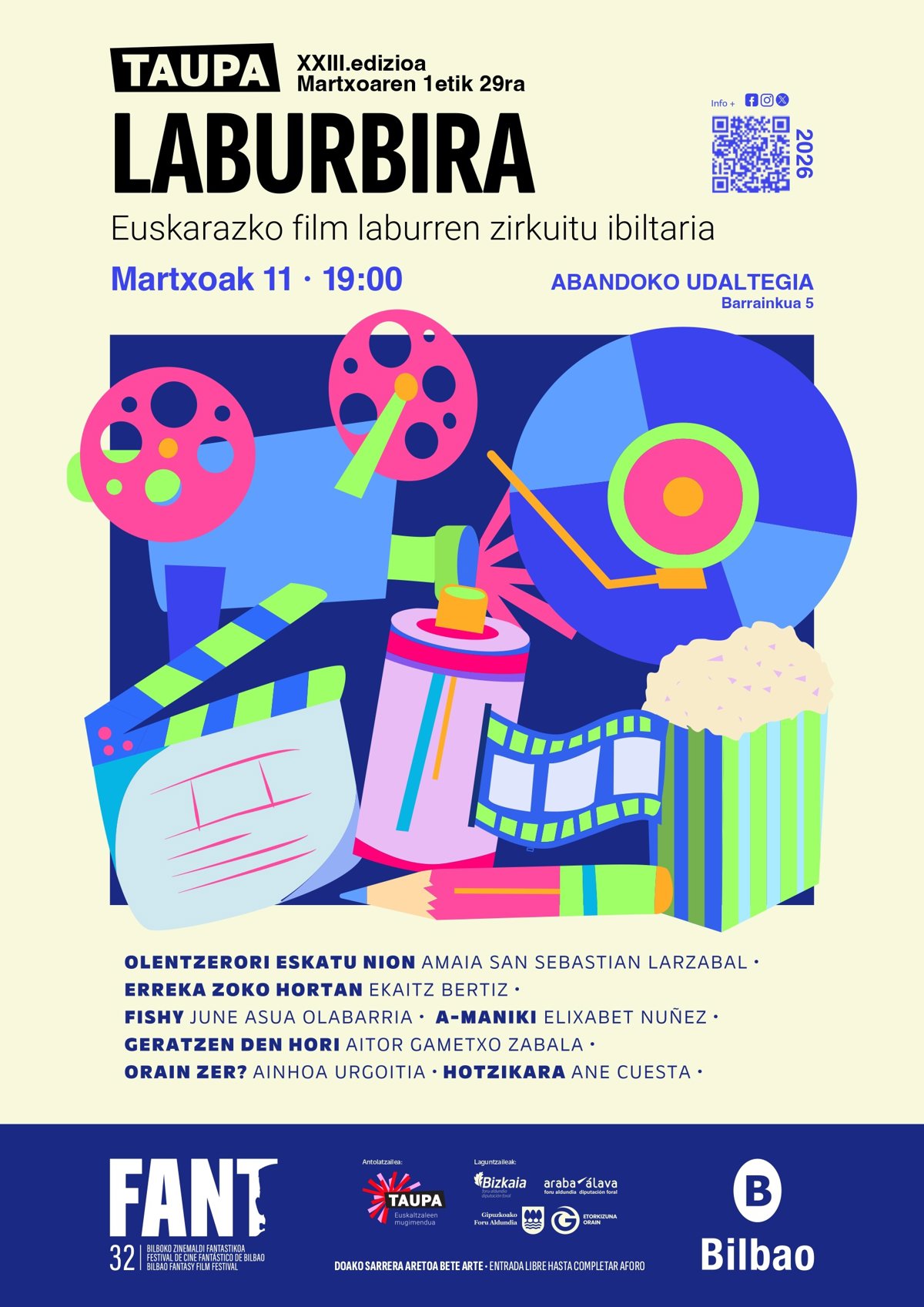 Bilboko Udalak antolatutako FANT Zinemaldi Fantastikoak PreFANT zikloarekin jarraitzen du eta Taupa Mugimenduak antolatutako Laburbira euskartazko film laburren zirkuitu ibiltariaren sei lan eskainiko ditu: 'Olentzerori eskatu nion' (Amaia San Sebastian Larzabal), 'Erreka zoko hortan' (Ekaitz Bertiz), 'Fishy' (June Asua Olabarria), 'A-Maniki' (Elixabet Nuñez), 'Geratzen den hori' (Aitor Gametxo Zabala), 'Orain zer?' (Ainhoa Urgoitia) eta 'Hortzikara' (Ane Cuesta).