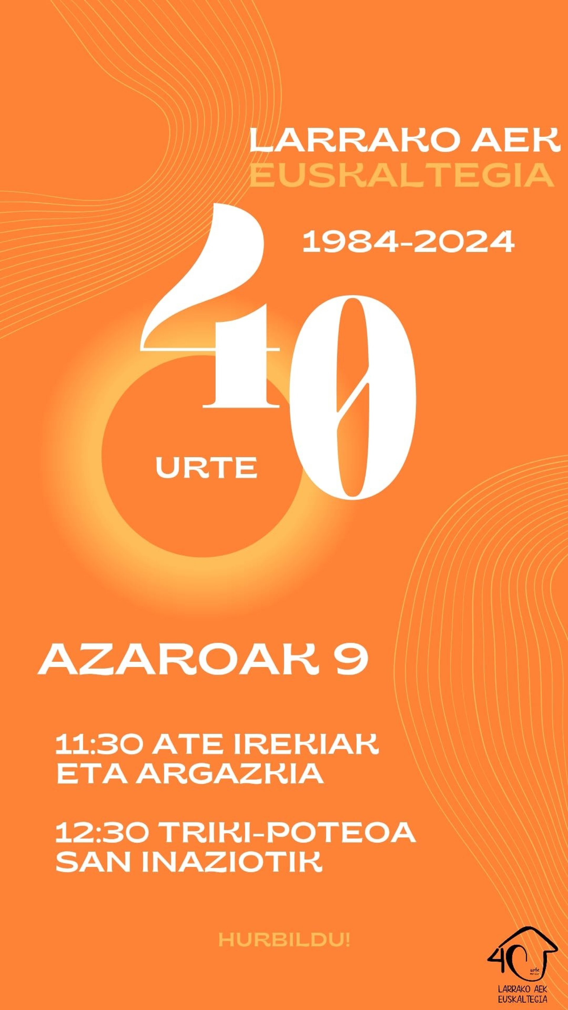 Larrako AEK euskaltegiaren 40. urteurreneko ospakizuna larunbatean bukatuko da, azaroaren 9an, 11:30ean euskaltegiko ateak ireki eta bertaratzen diren guztiekin argazki erraldoia aterata. Lau hamarkadotan bertatik igaro diren irakasle, ikasle eta laguntzaileak gonbidatu dituzte. Bukatzeko, 12:30ean, triki-poteoa egingo dute auzoan zehar.