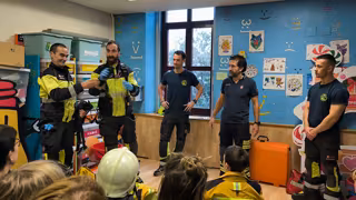 Jaka luzea eta esku hartzeko kaskoa probatzen utzi diete umeei, haiekin argazkiak atera dituzte eta gaixotasuna dela-eta atera ezin diren haurren gelak bisitatu dituzte.
