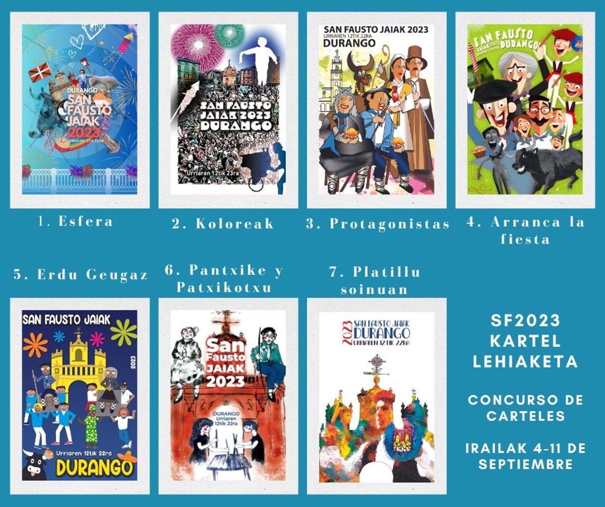 Durangoko Udaletik jakinarazi dutenez, aurkeztu diren 28 karteletatik zazpi lan aukeratu ditu epamanahiak: 'Esfera', 'Koloreak', 'Protagonistas', 'Arranca la fiesta', 'Erdu Geugaz', 'Pantxike eta Patxikotxu presiden la fiesta desde la puerta de Santa Ana' eta 'Platillu soiñua'.