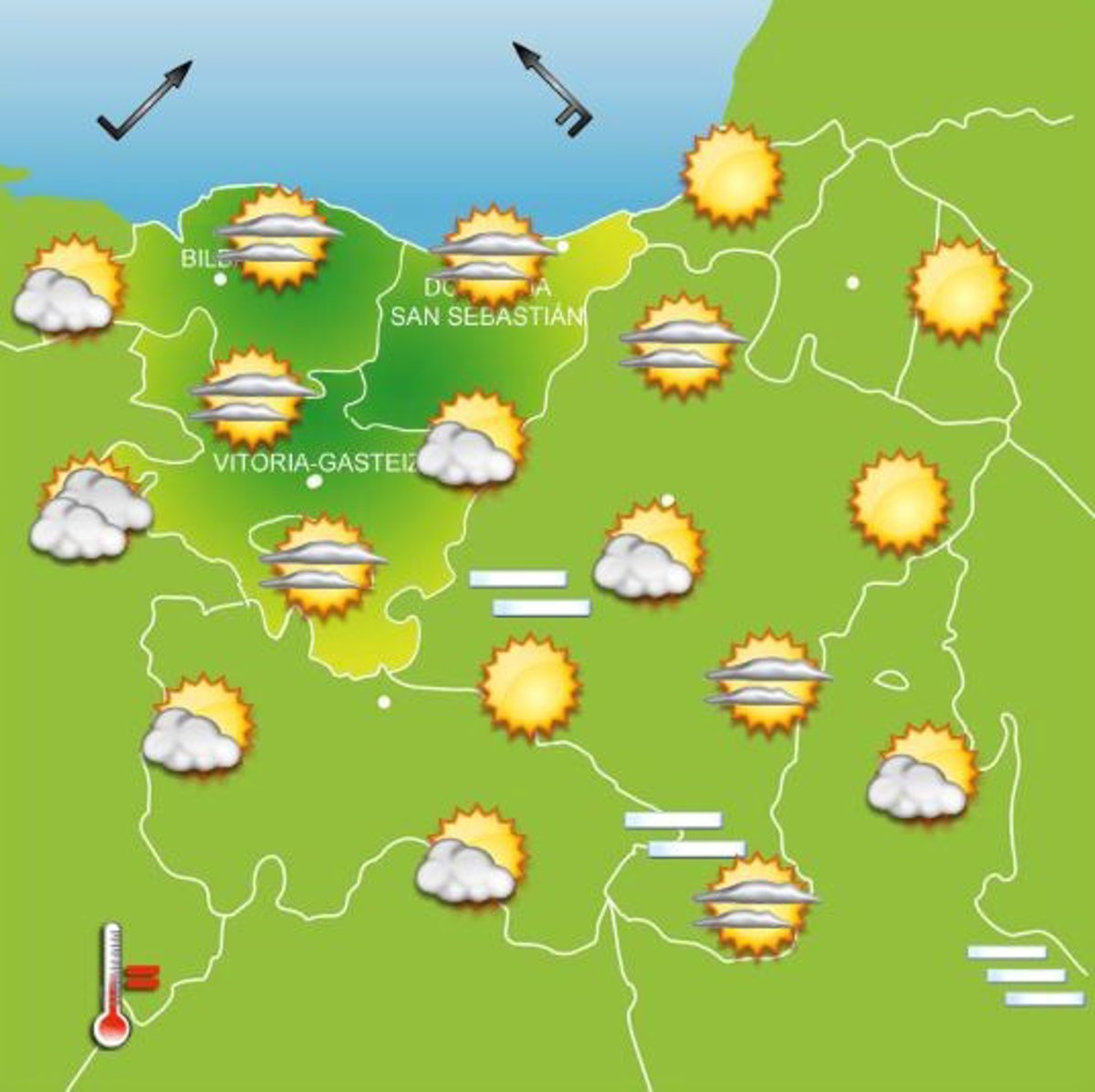 Tenperaturan, ez da aldaketarik espero. Hiriburuetan, Bilbon 10 gradu espero dira gutxienez eta 19 gehienez, Donostian 10 gutxienez eta 18 gehienez, Gasteizen 1 gutxienez eta 14 gehienez, eta Iruñean 1 gutxienez eta 13 gehienez.