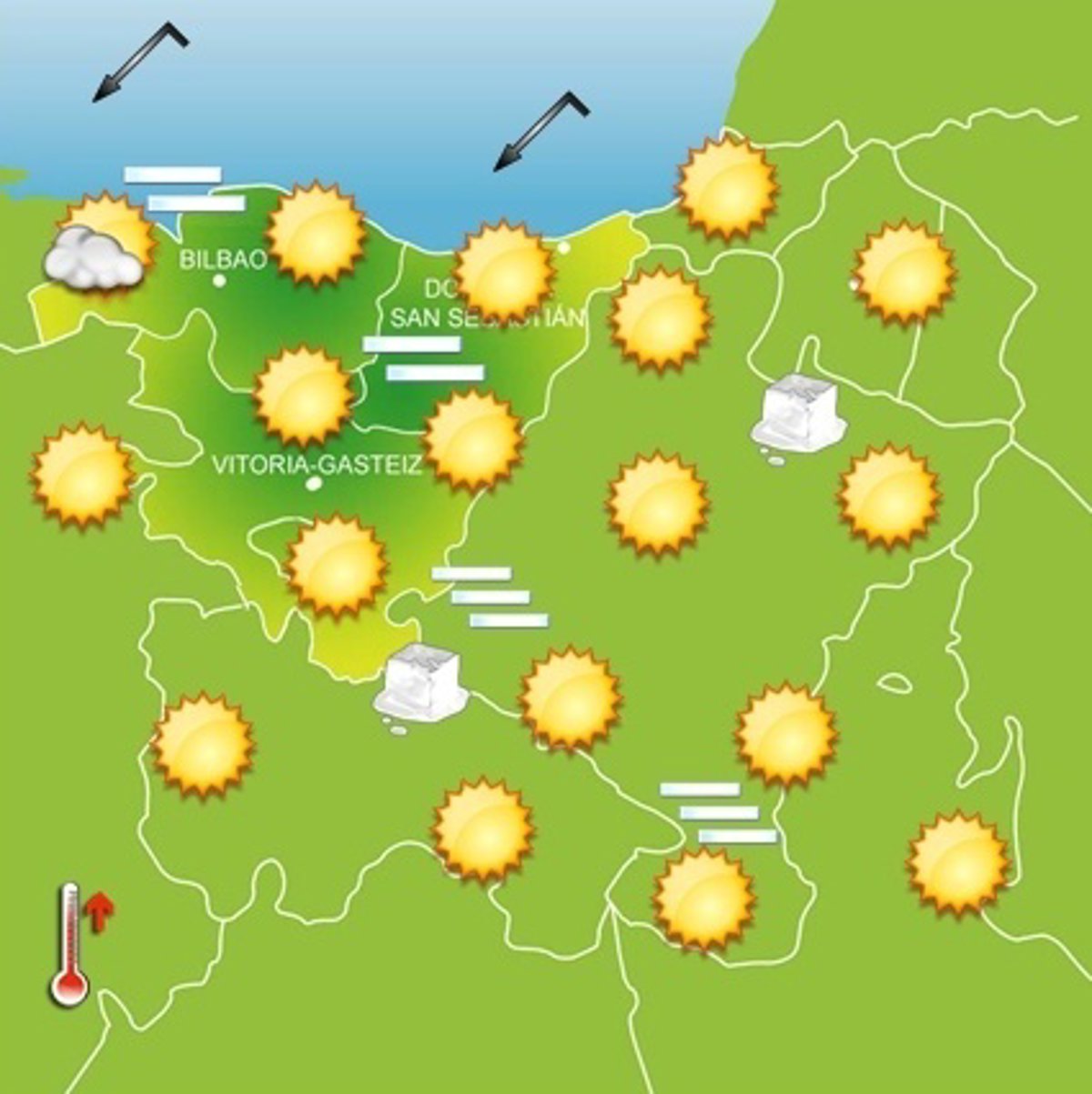 Tenperatura maximoak 20 gradutik gora izango dira, barnealdean batez ere. Tenperatura minimoak, aldiz, hotzak izango dira eta barnaldean izotz txikia egingo du. Kostaldean maximoak 18-20 graduren bueltan geratuko dira, brisa ibiliko baita. Gainera behe-hodei tarte batzuk sortu daitezke.