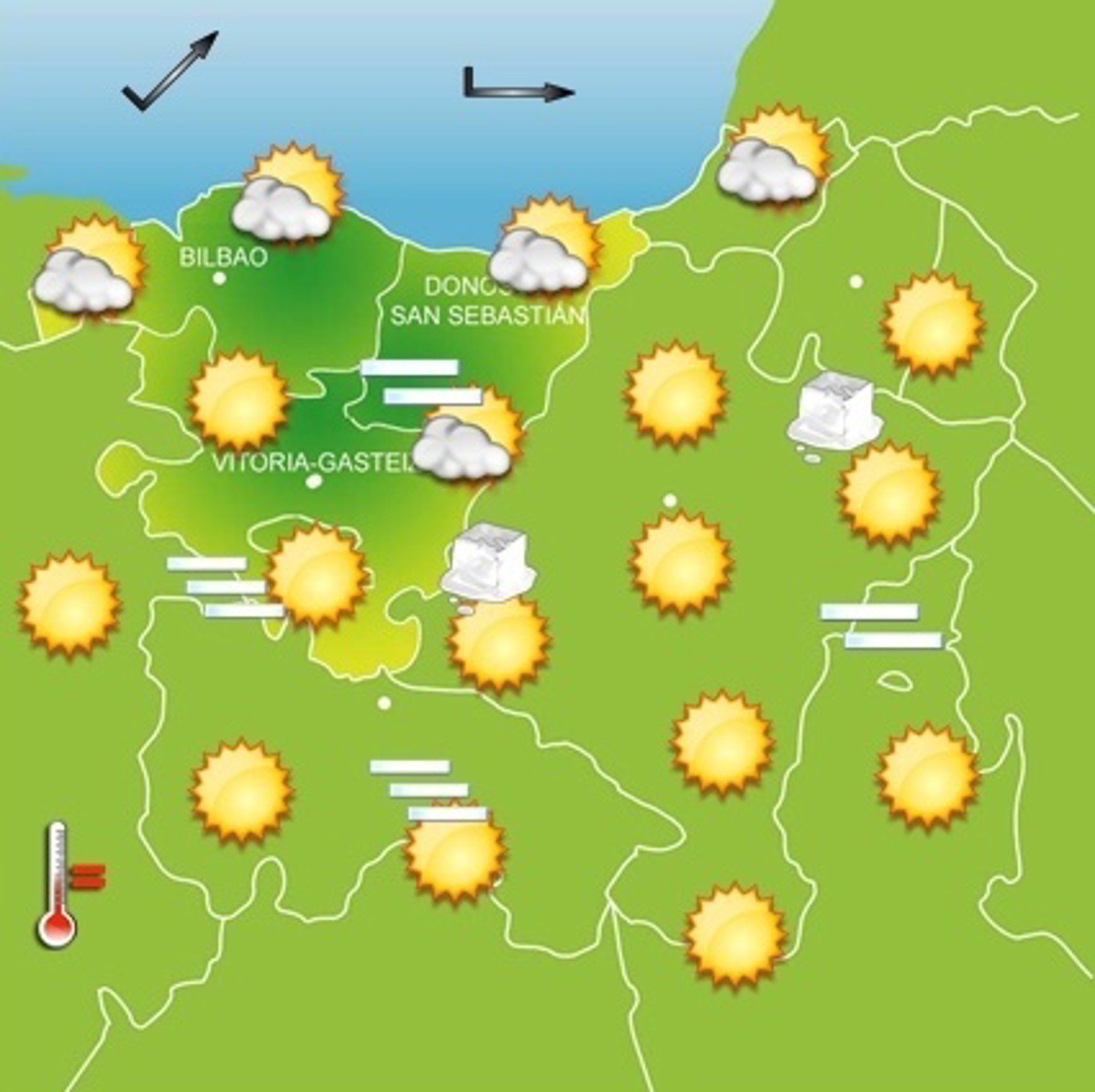 Eguna hotzetik esnatuko bada ere, barnealdeko hainbat txokotan zeropeko balioekin, gerora epeltasuna ekarriko du hego ukituko haizeak eta beroenak 16-17 gradura gerturatuko dira kostaldean eta 13-15 gradu artean geldituko dira barnealdean. Hiriburuetan, Bilbon 7 gradu espero dira gutxienez eta 17 gehienez, Donostian 7 gutxienez eta 16 gehienez, Gasteizen 0 gutxienez eta 13 gehienez, eta Iruñean 3 gutxienez eta 14 gehienez.