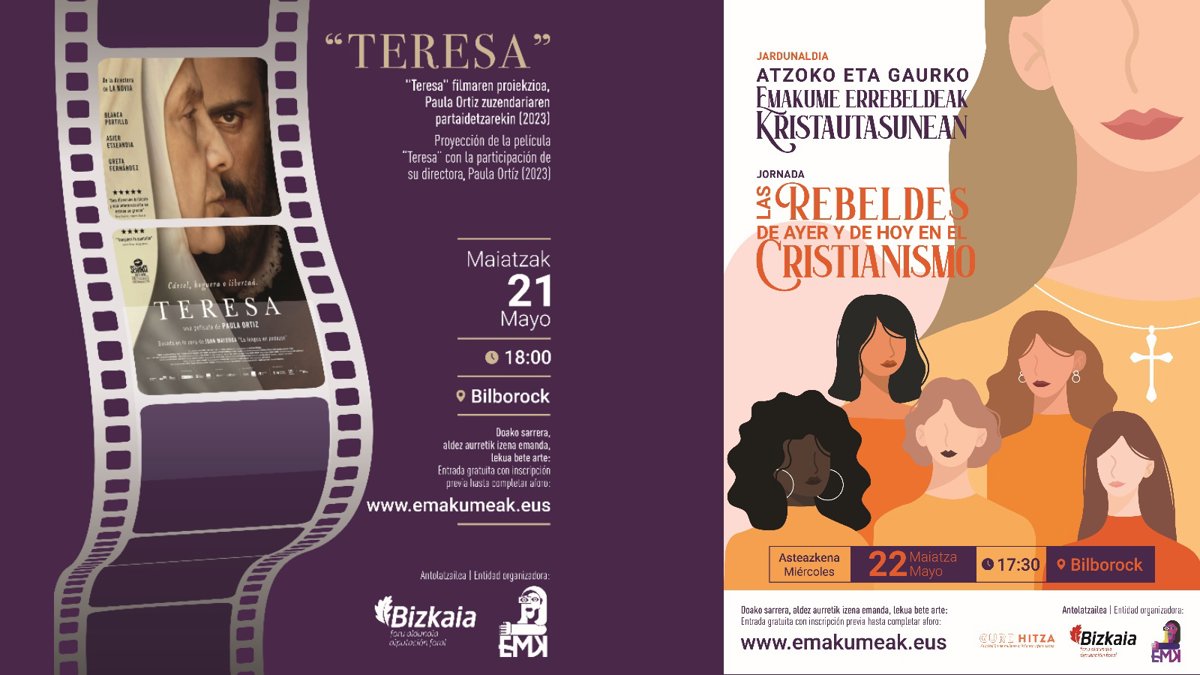 Bizkaiko Foru Aldundiaren 'Emakumeak' feminismoaren eta emakumeen eta gizonen berdintasunaren aldeko estrategiak bere egitarauari helduko dio berriro aste honetan bi jarduera berrirekin. Zehazki, 'Teresa' filma proiektatuko da astearte honetan, maiatzaren 21ean, eta 'Atzoko eta gaur egungo matxinatuak kristautasunean' jardunaldia egingo da asteazkenean, hilaren 22an, emakumeak erlijioan betetzen duen rolari buruzko eztabaidara eta hausnarketara gonbidatzeko.