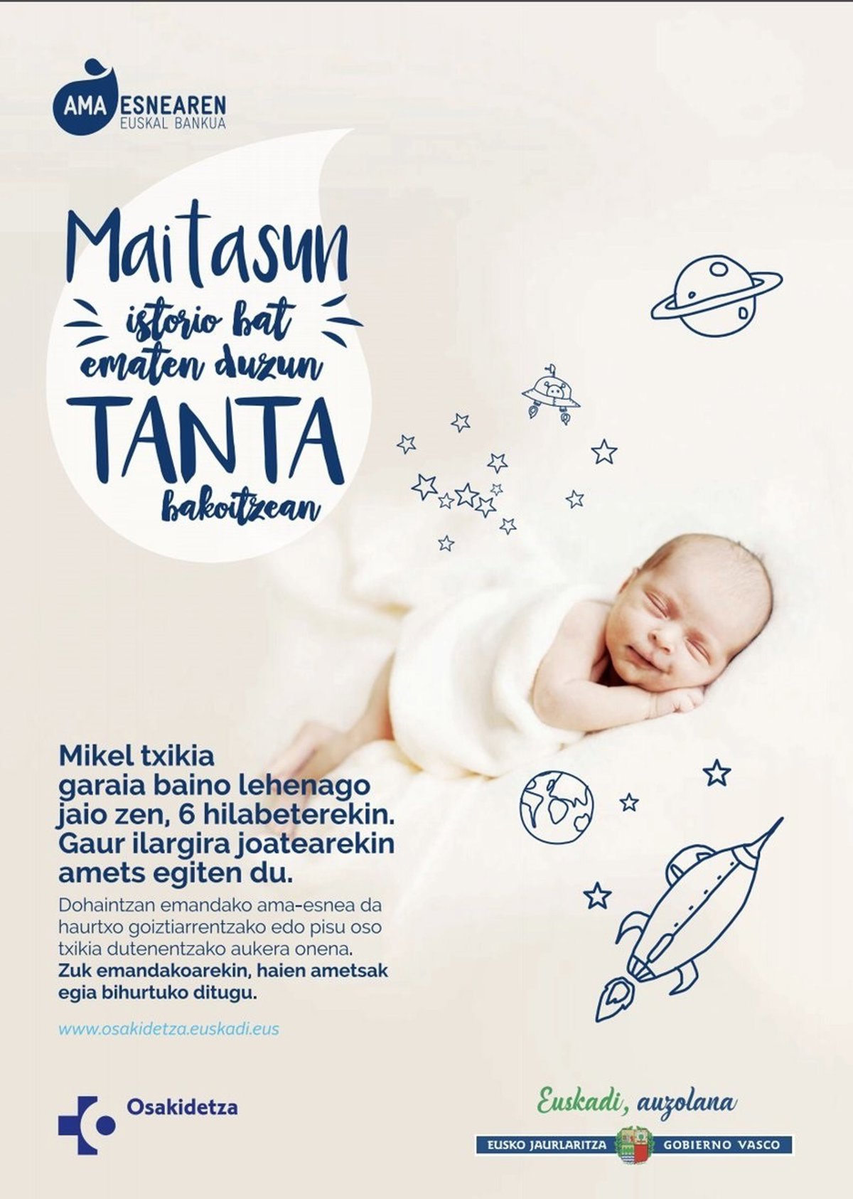 Larunbatean, maiatzaren 19an, Ama Esnea Dohaintzan emateko Nazioarteko Eguna da, eta Jon Darpon Eusko Jaurlaritzako Osasun sailburuak eskerrak eman ditu Euskadiko Ama Esnearen Bankuko 64 euskal ama emaileen ahaleginagatik, denboragatik eta eskuzabaltasunagatik. Ama esnea dohaintzan ematea zer garrantzitsua den nabarmendu du, litro bat esneren bidez hamar haurri lagundu baitakieke.