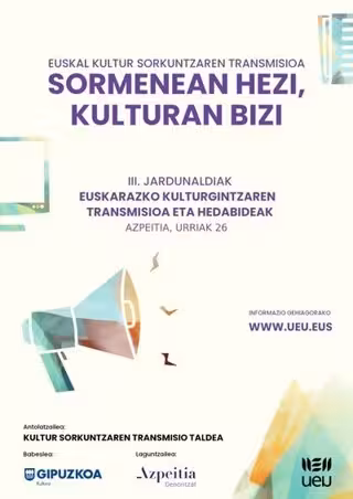 'Euskal kulturgintzaren transmisioa eta hedabideak' jardunaldien hirugarren edizioa egingo da Azpeitian larunbatean, urriaren 26an, Ahotseneak, Bertsozale elkarteak, EIEk, EIZIEk, Elkar fundazioak, Euskal Wikilarien Elkarteak, Hik Hasik, Jakinek, Lanarteak eta UEUk osatutako Kultur Sorkuntzaren Transmisioa Taldeak antolatuta eta Gipuzkoako Foru Aldundiak babestuta.