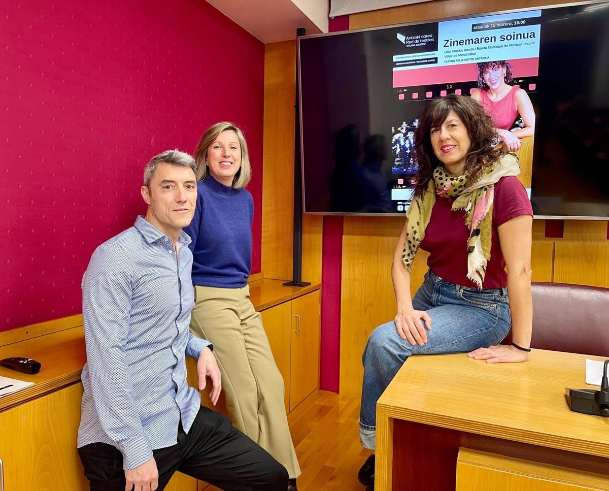 Sonia Diaz de Corcuera Gasteizko Udaleko Kultura zinegotziak, Iker Olazabal Gasteizko Udal Musika Bandako zuzendariak eta Josune Velez de Mendizabalek berak aurkeztu dute ikuskizuna astelehen honetan udaletxean egindako prentsa agerraldian.