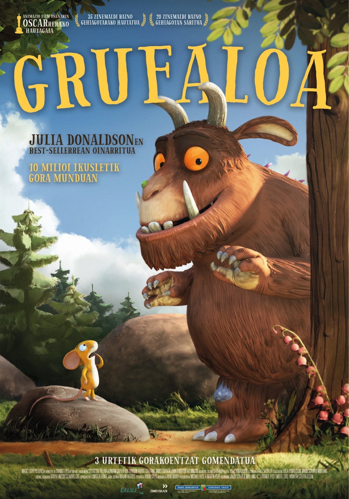 Eusko Jaurlaritzak Zineuskadi plataformaren bidez sustatzen duen Zinema Euskaraz programari esker, Julia Donaldson idazlearen "Grufaloa" obraren zinemarako moldaketa ikusi ahal izango da euskaraz Euskadiko zenbait zinema aretotan. Mundu osoan liburuaren 13 milioi ale saldu dira.