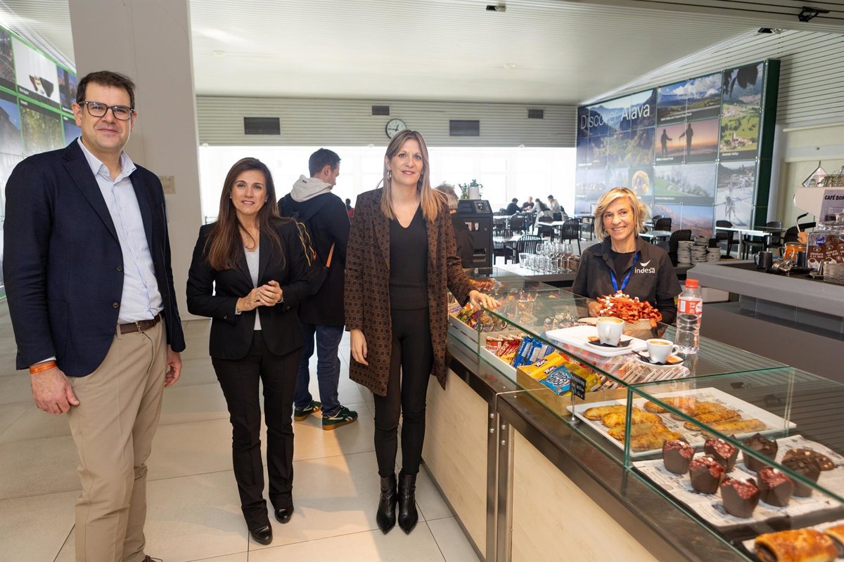 Saray Zarate Ekonomia Garapenaren eta Jasangarritasuneko foru diputatua eta Ander Eguidazu Indesako zuzendari kudeatzailea kafetegiko instalazioetan izan dira asteazken honetan, Begoña Llarena Gasteizko aireportuko zuzendariarekin batera.
