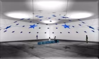La muestra en sala contiene una instalación, obras murales, material audiovisual y una maqueta de la cúpula Starry Dome (de 20 x 20 x 6 metros) de diseño sofisticado.