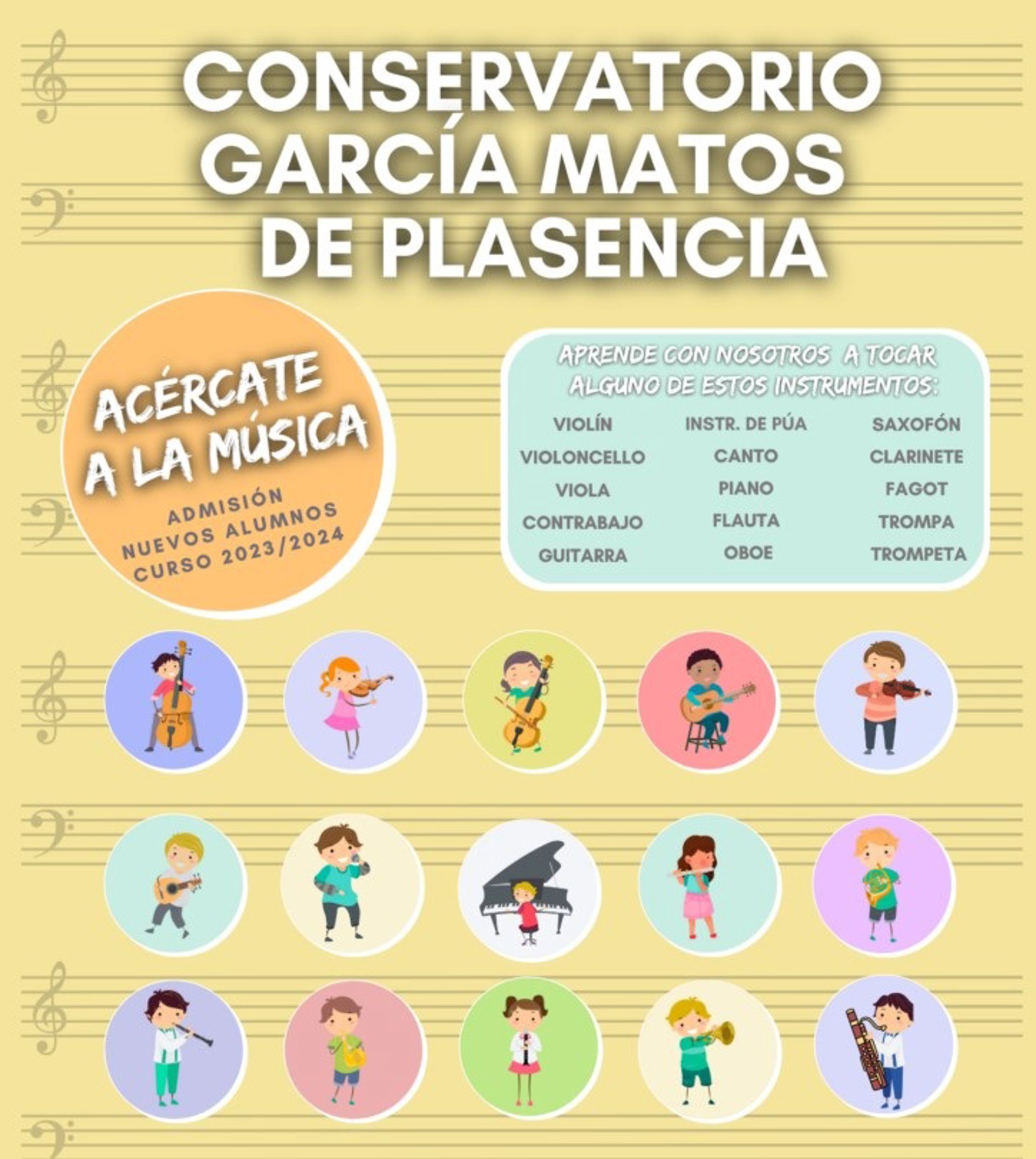 El Conservatorio Profesional de Música García Matos de Plasencia, dependiente de la Diputación de Cáceres, ha abierto ya el plazo de inscripción para el curso 2023/2024, y lo hace bajo el lema 'Acércate a la música'.