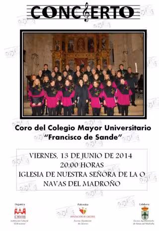 El coro del Colegio Mayor 'Francisco de Sande', centro dependiente de la Diputación de Cáceres, ofrece este viernes, 13 de junio, un concierto en la localidad cacereña de Navas del Madroño con motivo de la bienvenida que el pueblo ha preparado a su nuevo párroco.